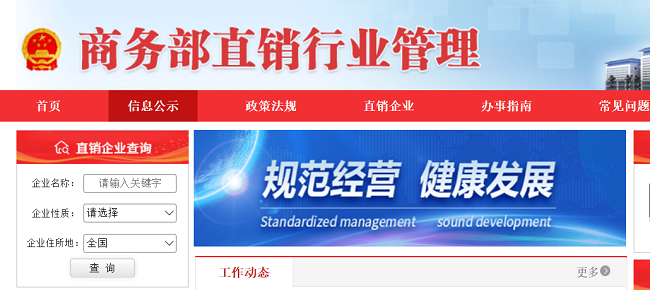2、商务部直销行业管理网站。该网站可以查询有资格从事直销的企业和相关产品情况。需要注意的是,能查到该直销企业并不意味着该企业完全可靠,该企业有《直销经营许可证》仅说明该企业有资格从事直销经营。