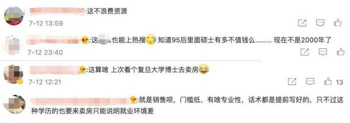 面对这样的状况,不少网友表示:“浪费资源”、“到了这个学术阶段做这份工作有些可惜”,但也有网友表示无奈,“硕士不值钱了”、“博士去卖房都不新鲜”。
