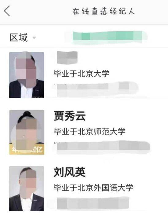 一款房产中介的APP特意将“双一流高校”作为用户检索、寻找房产经纪人的标签之一。APP在每个房产经纪人的头像下面注明其毕业高校,可以看到,他们中不乏名校毕业生。